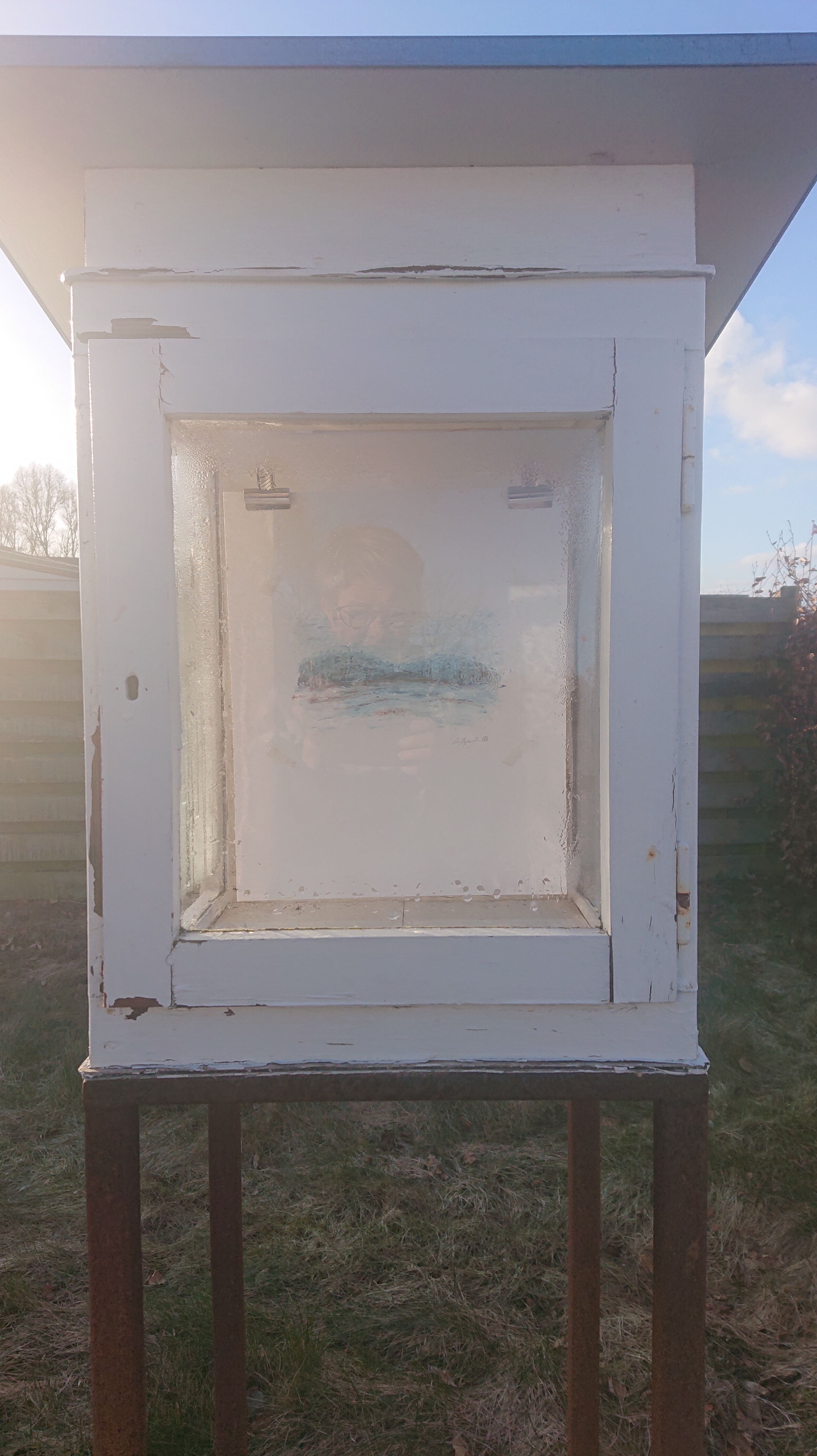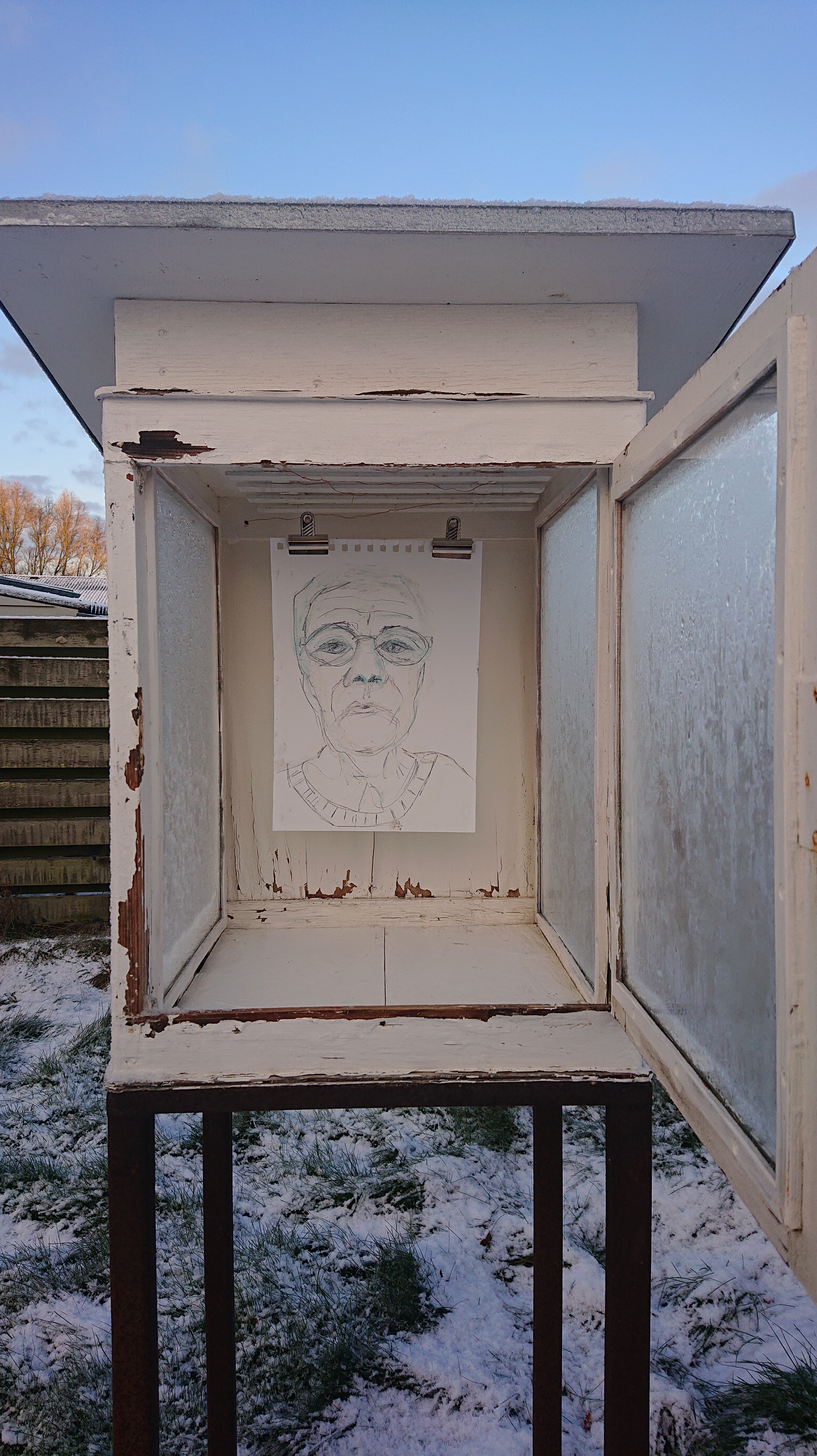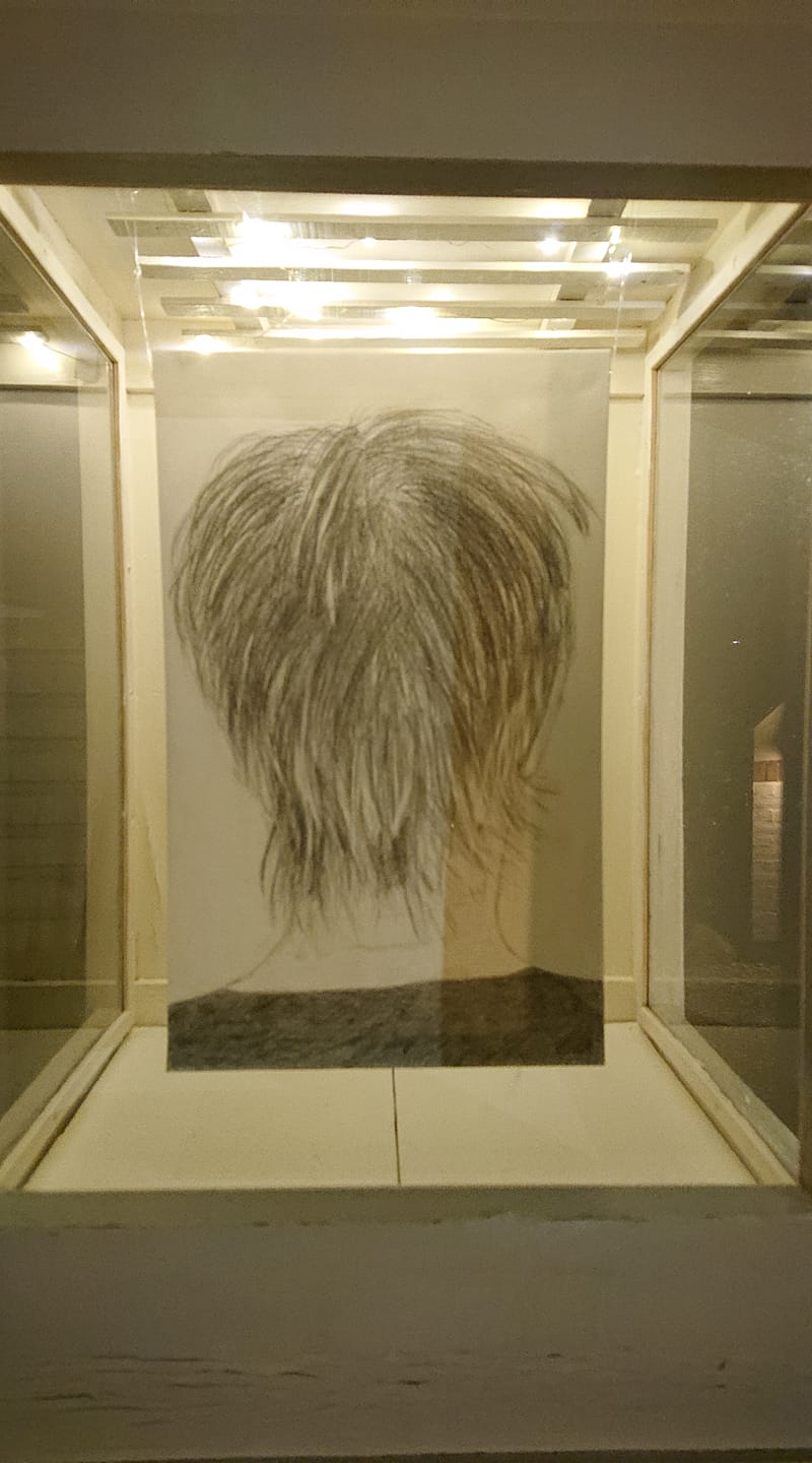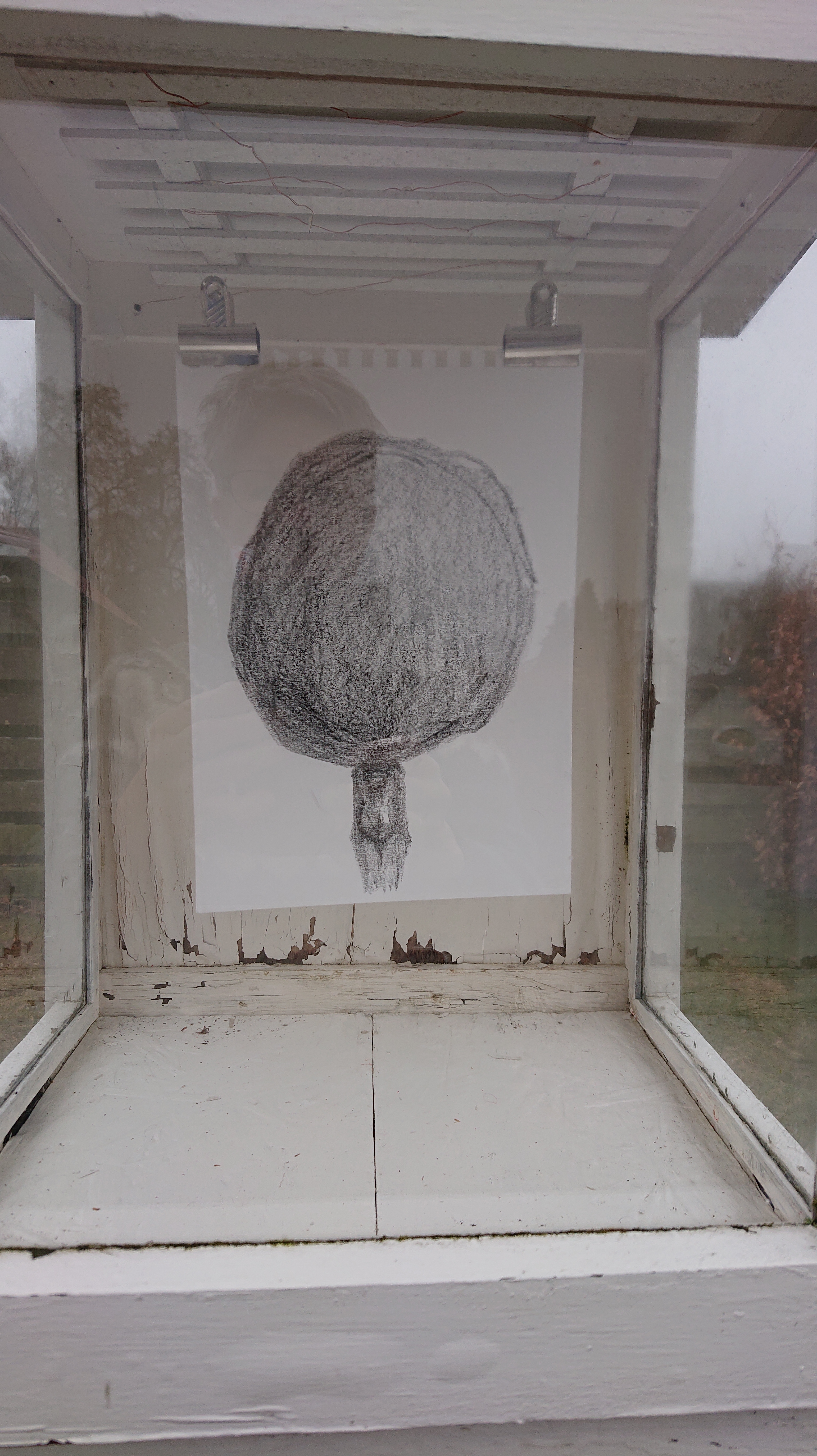 “Set bagfra. Selvportræt uden interiør”. Tegning.