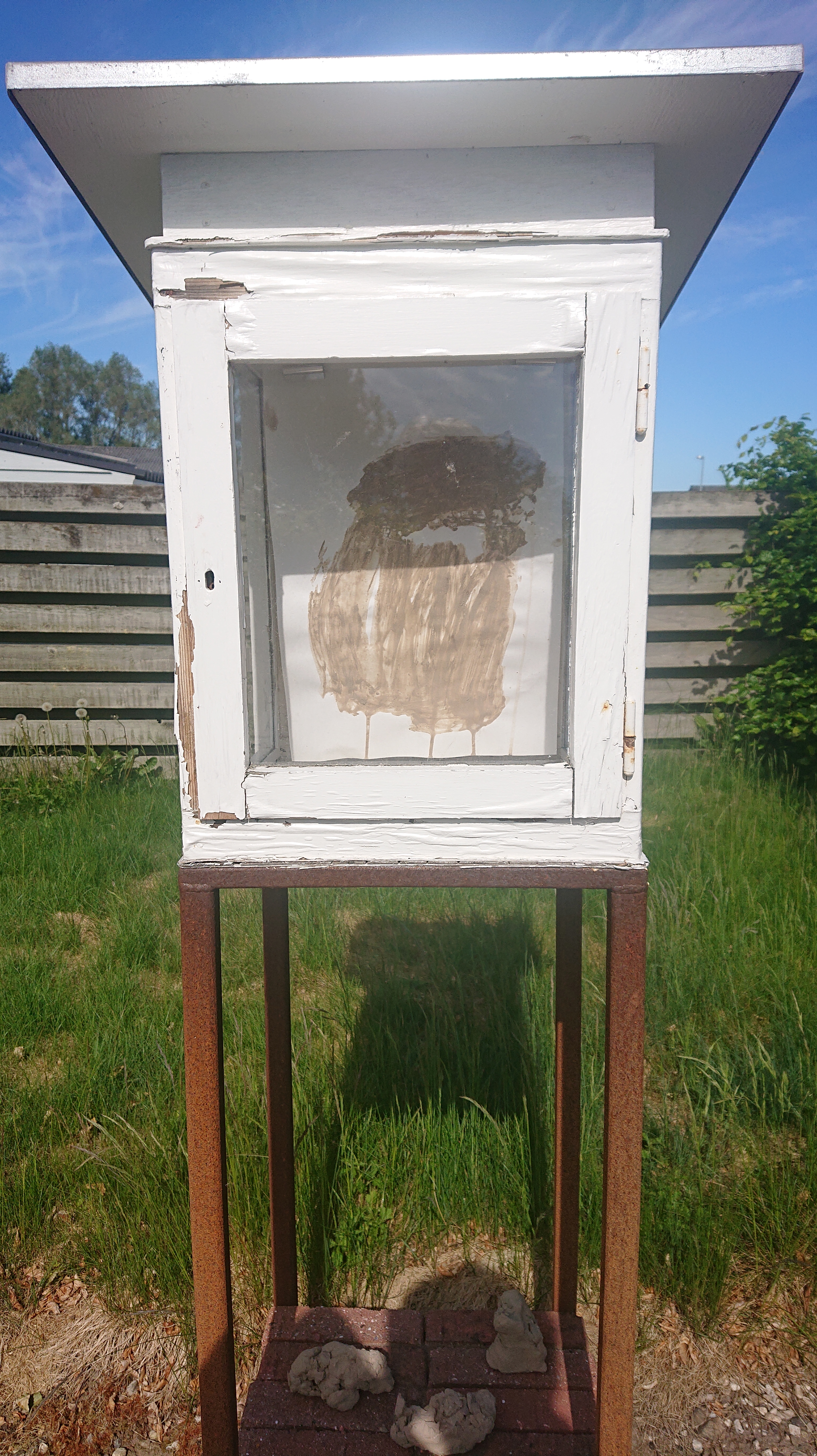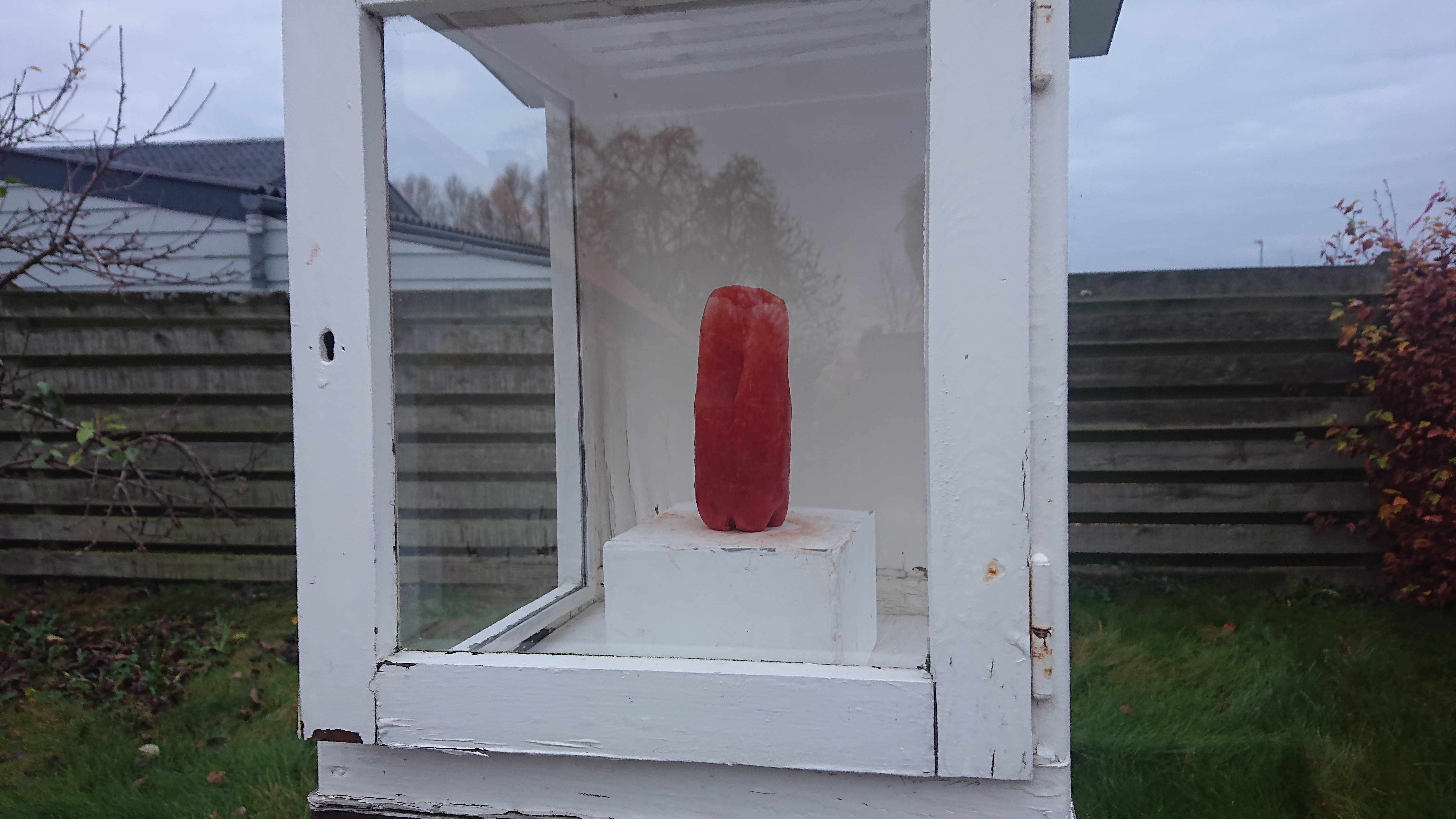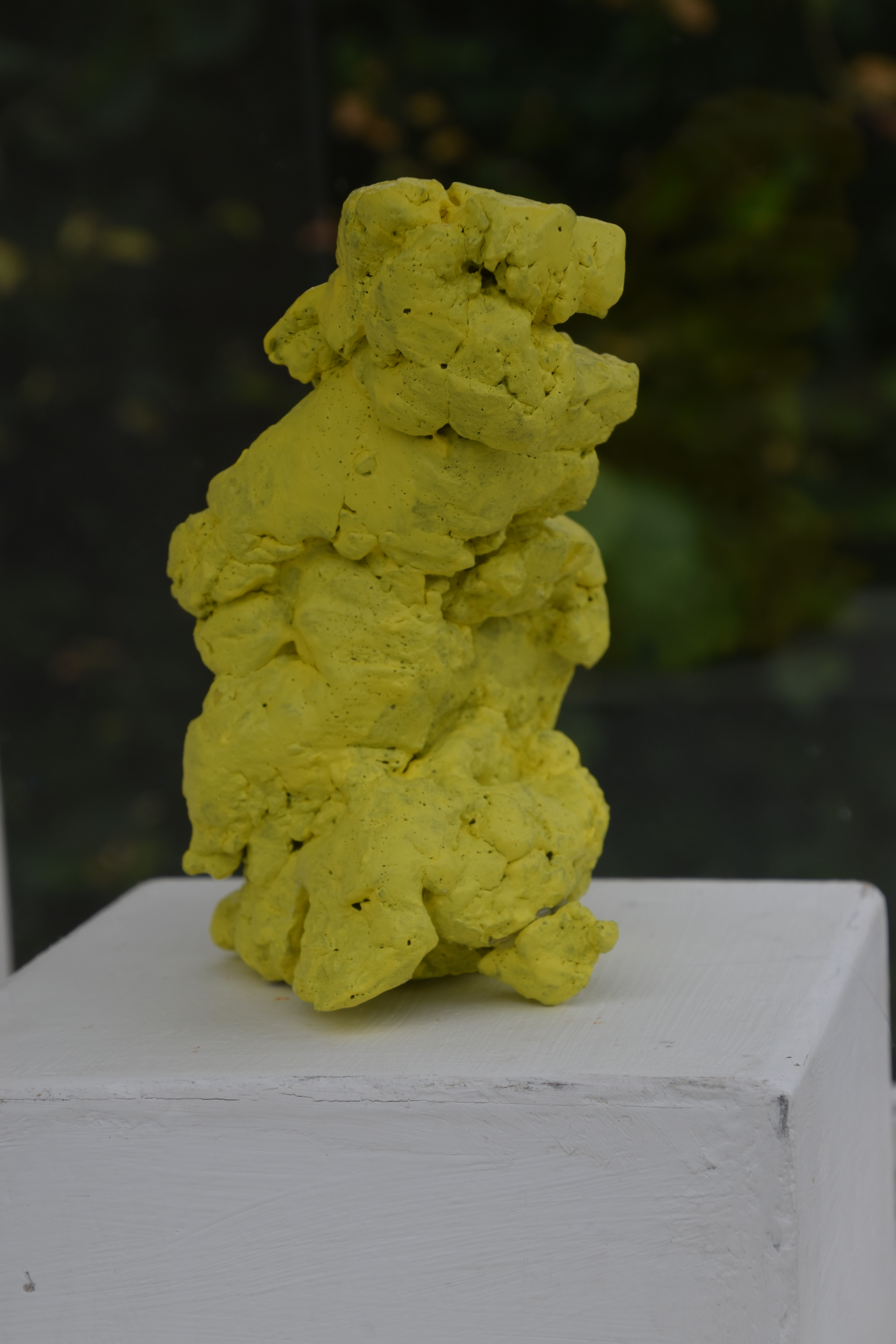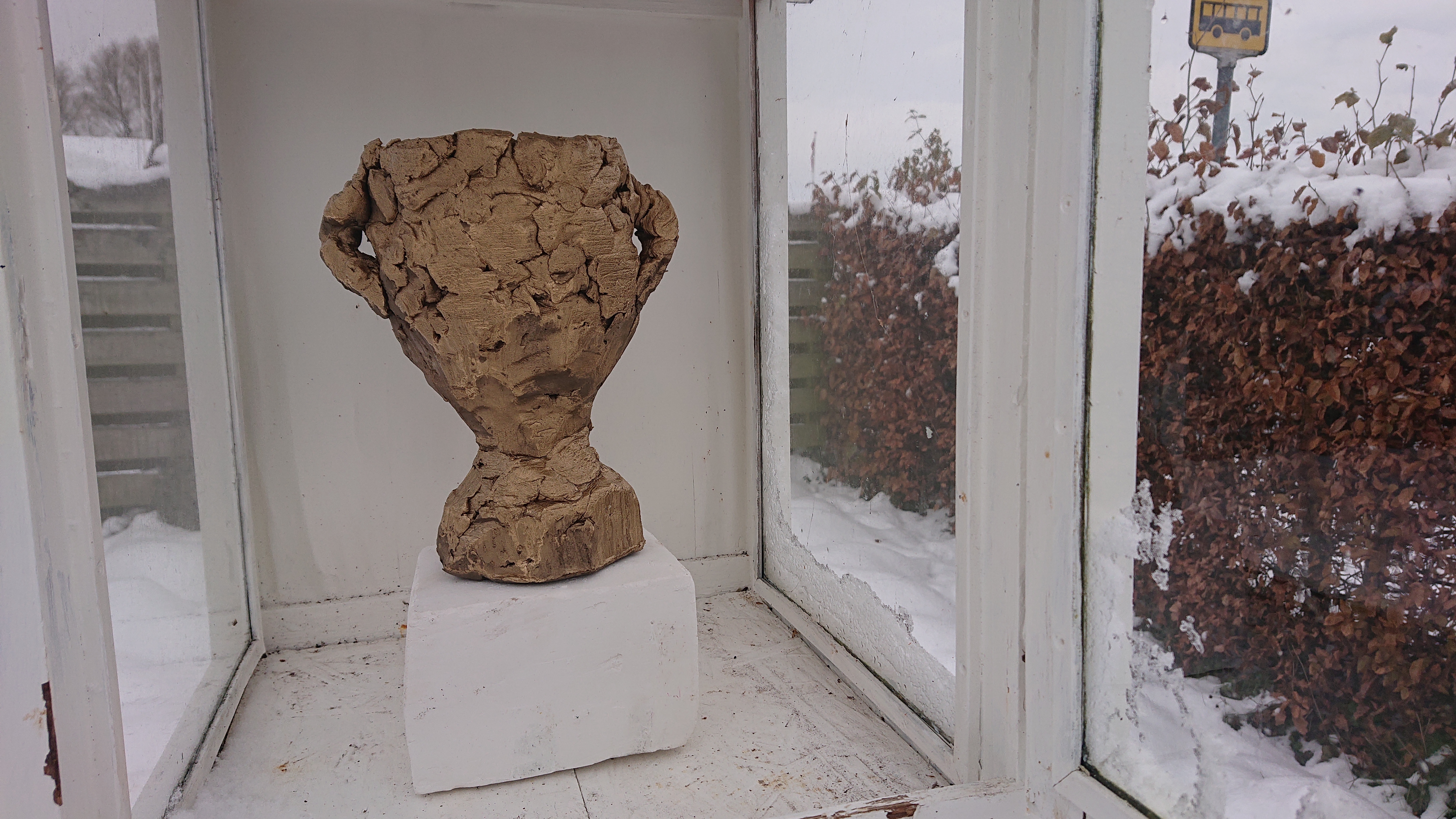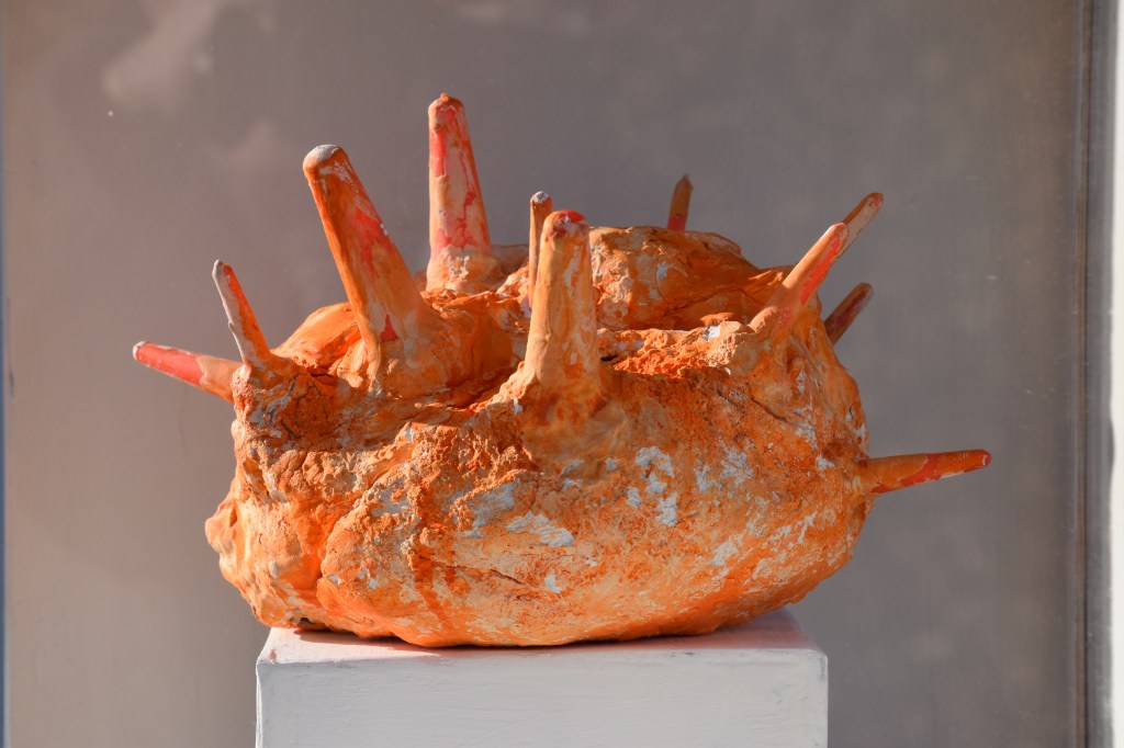 Gips, ostelærred, nytårsraketdutter, værkstedsaffald, akrylmaling.