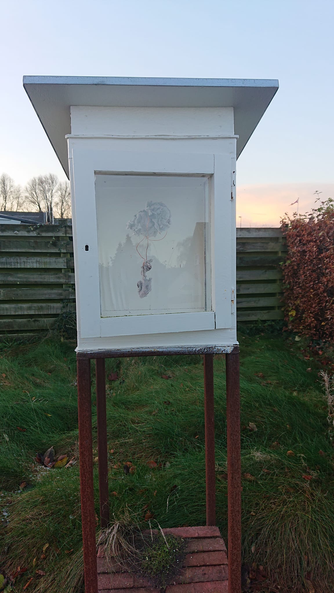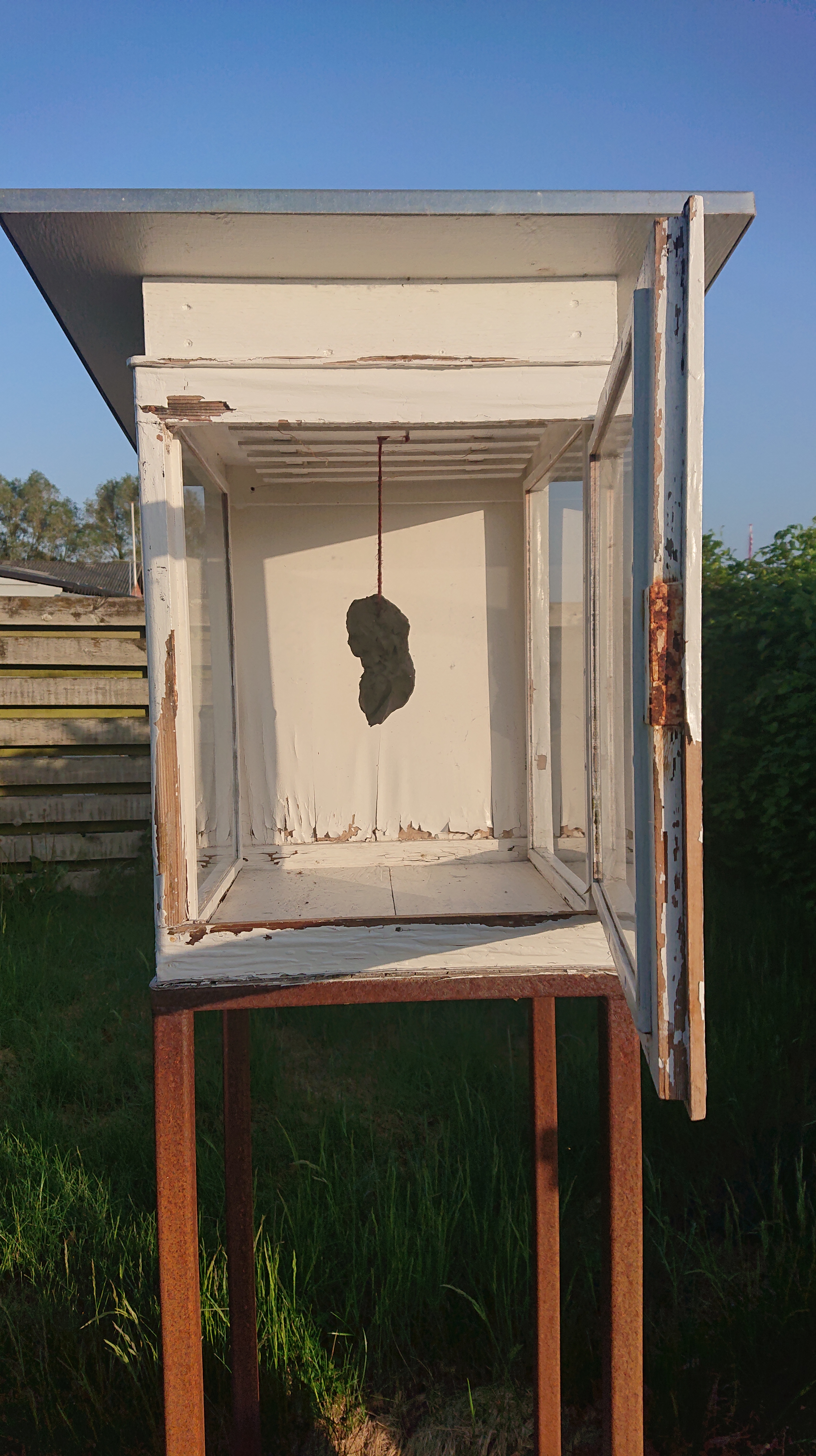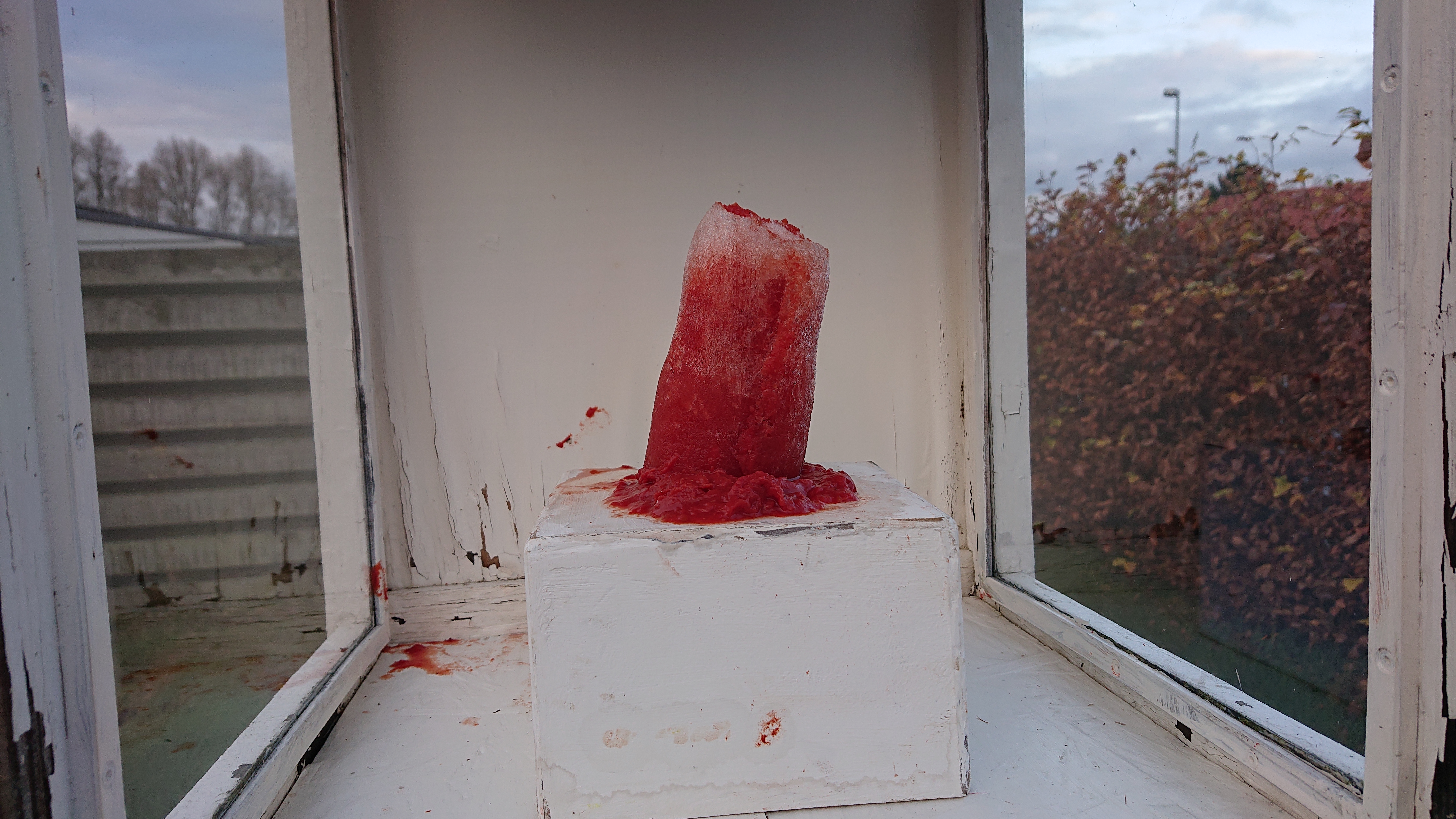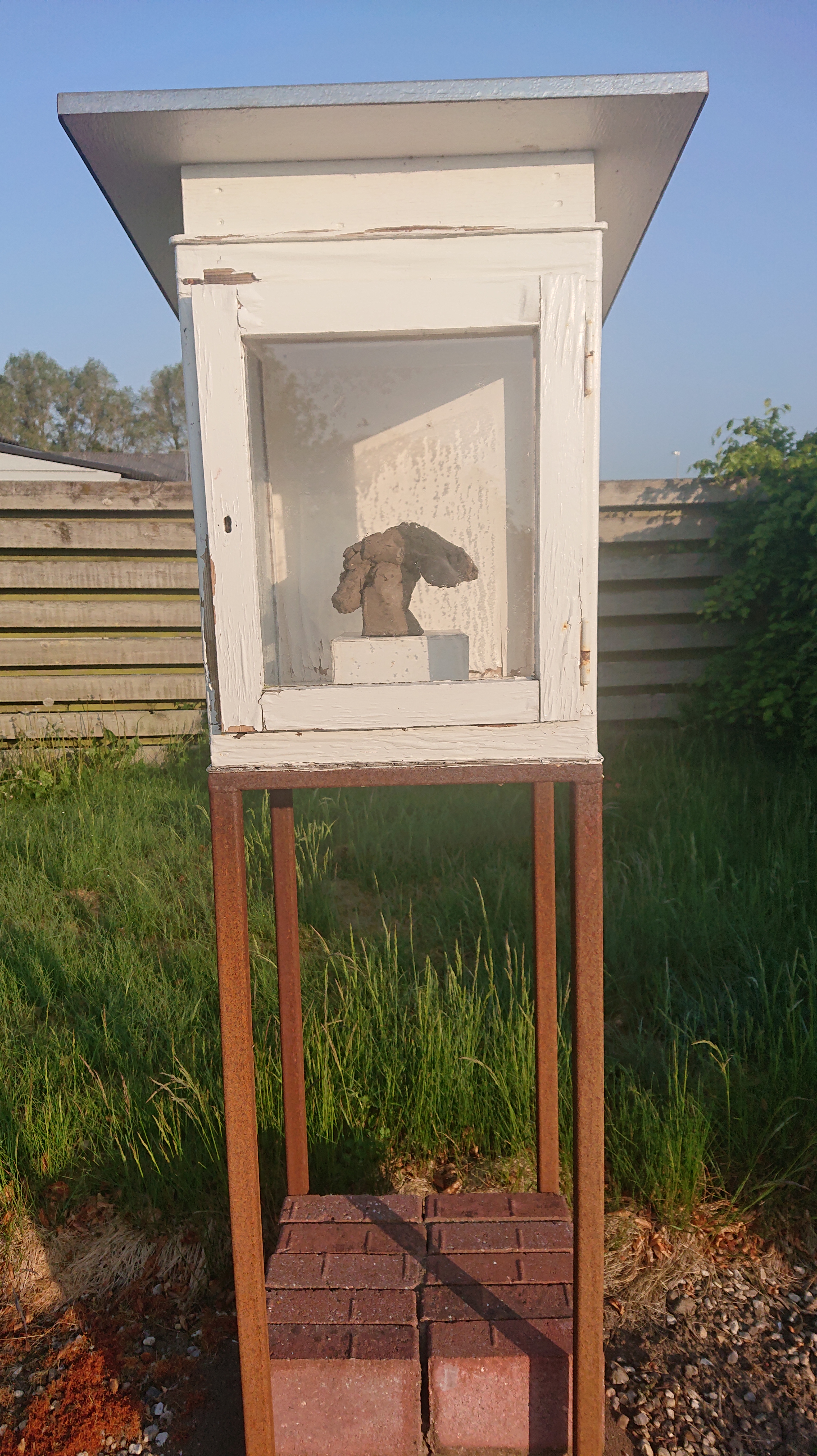 Gips, ostelærred, nytårsraketdutter, værkstedsaffald, akrylmaling.