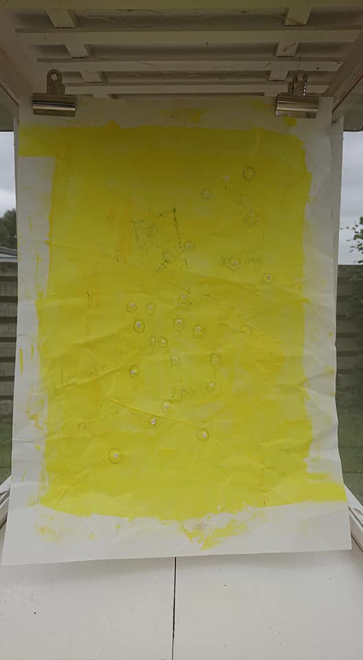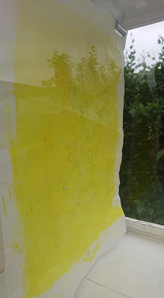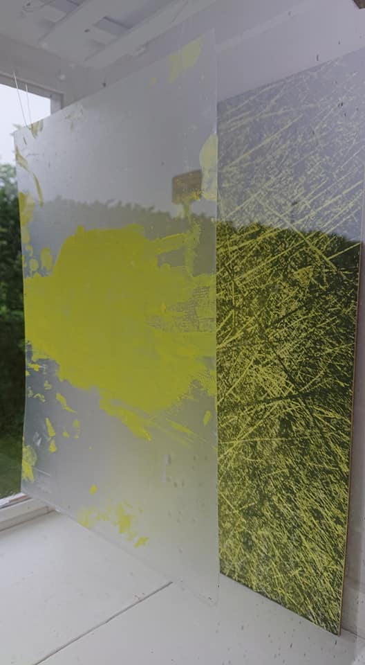 “Don’t be yellow 3”, Bemalet grafisk tryk på masonitplade, plastlomme, akrylmaling