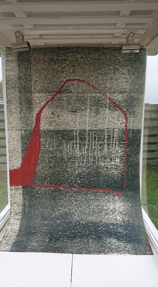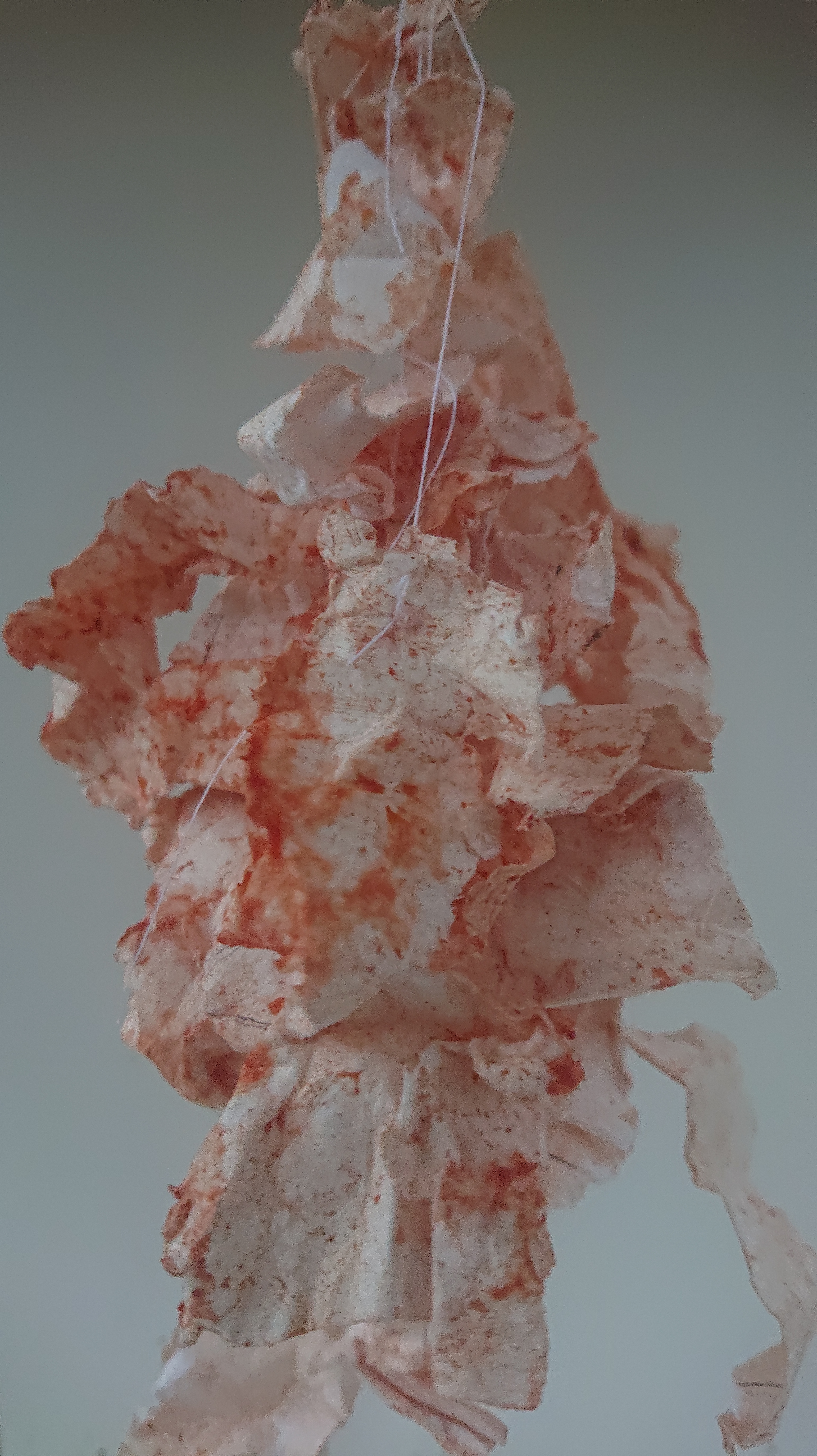 Objekt. Køkkenrulle, tusch, sytråd.