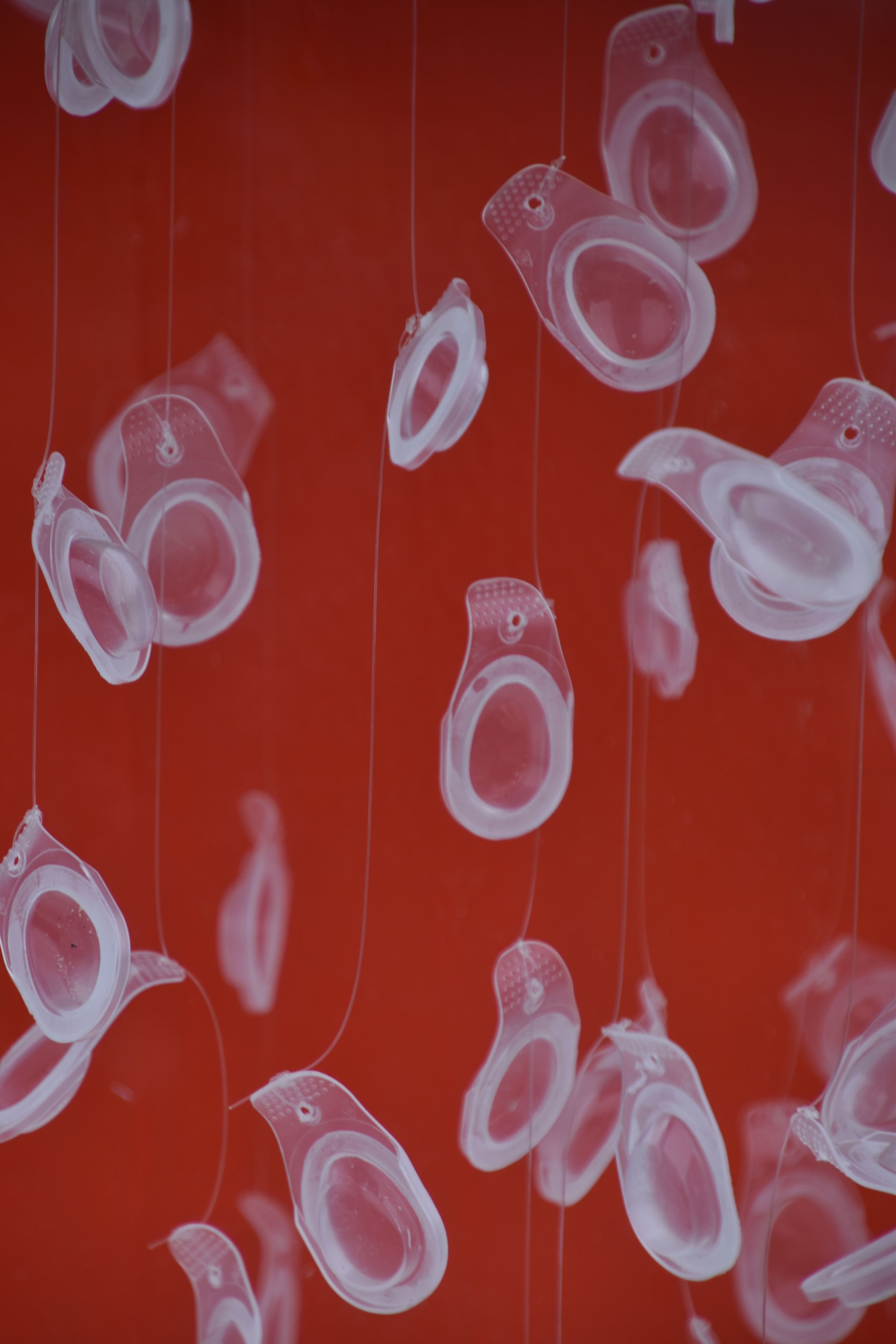 Brugte plastbeholdere fra endags-kontaktlinser. Blomsterpinde, ståltråd og fiskesnørre.