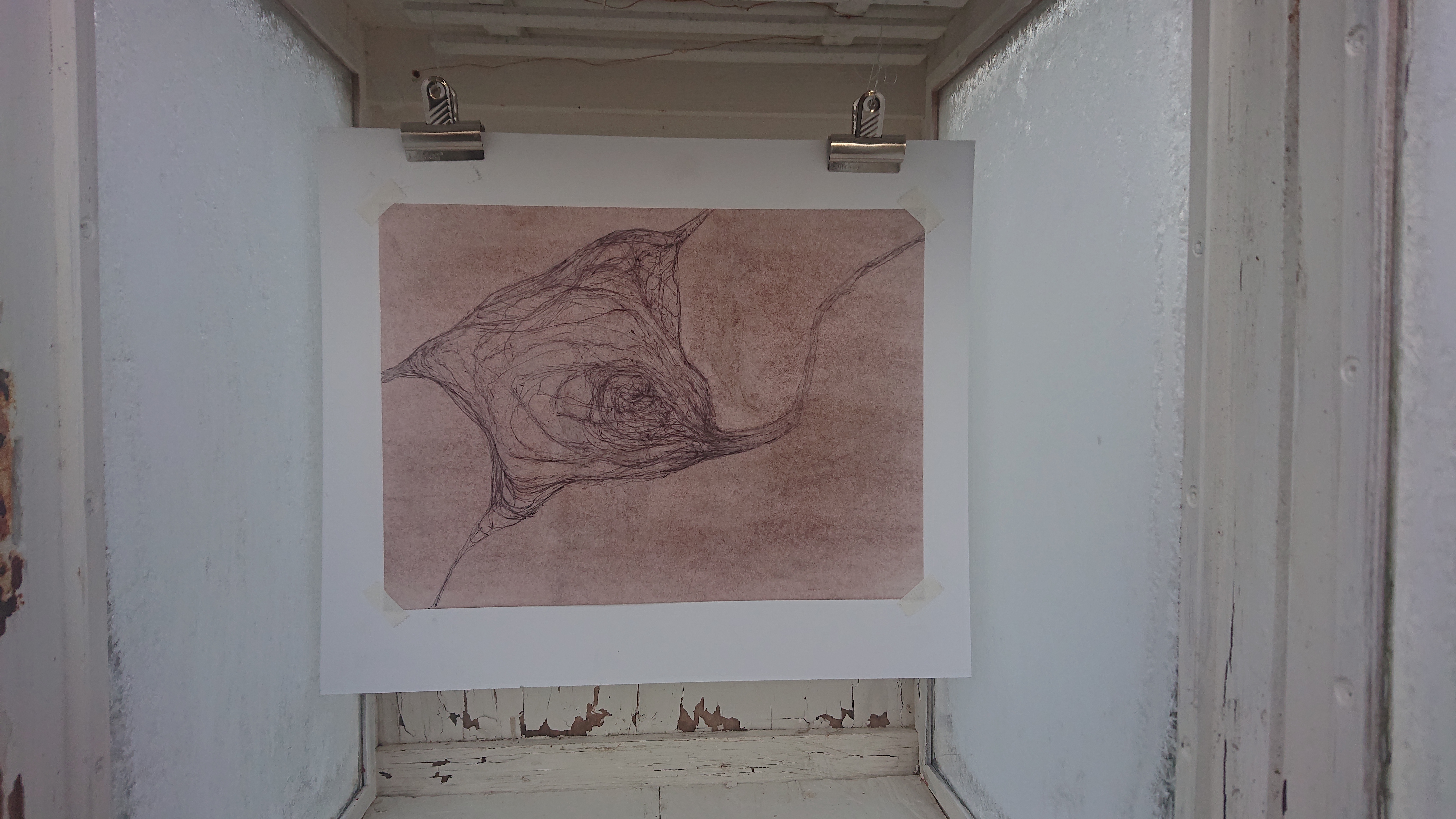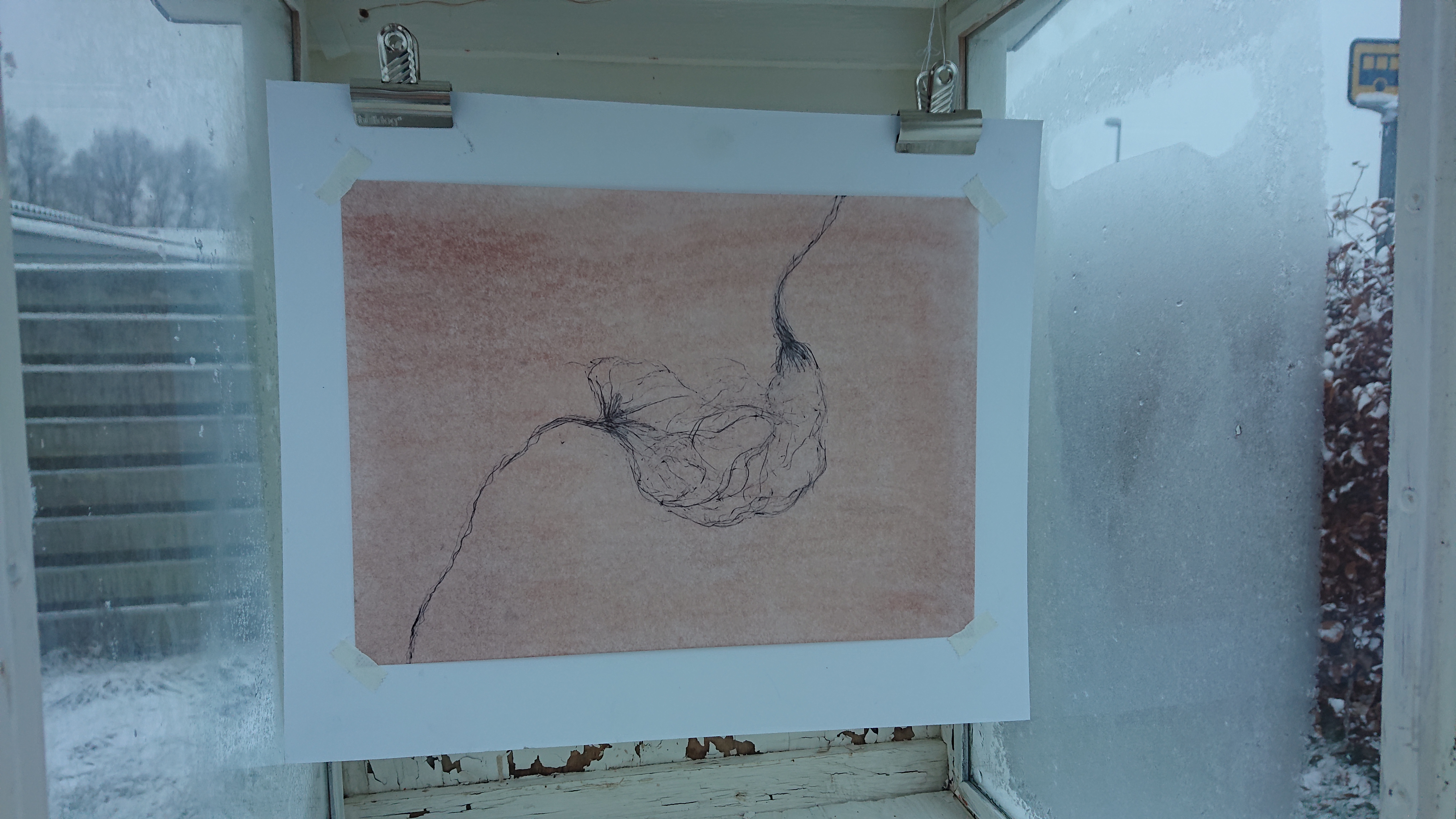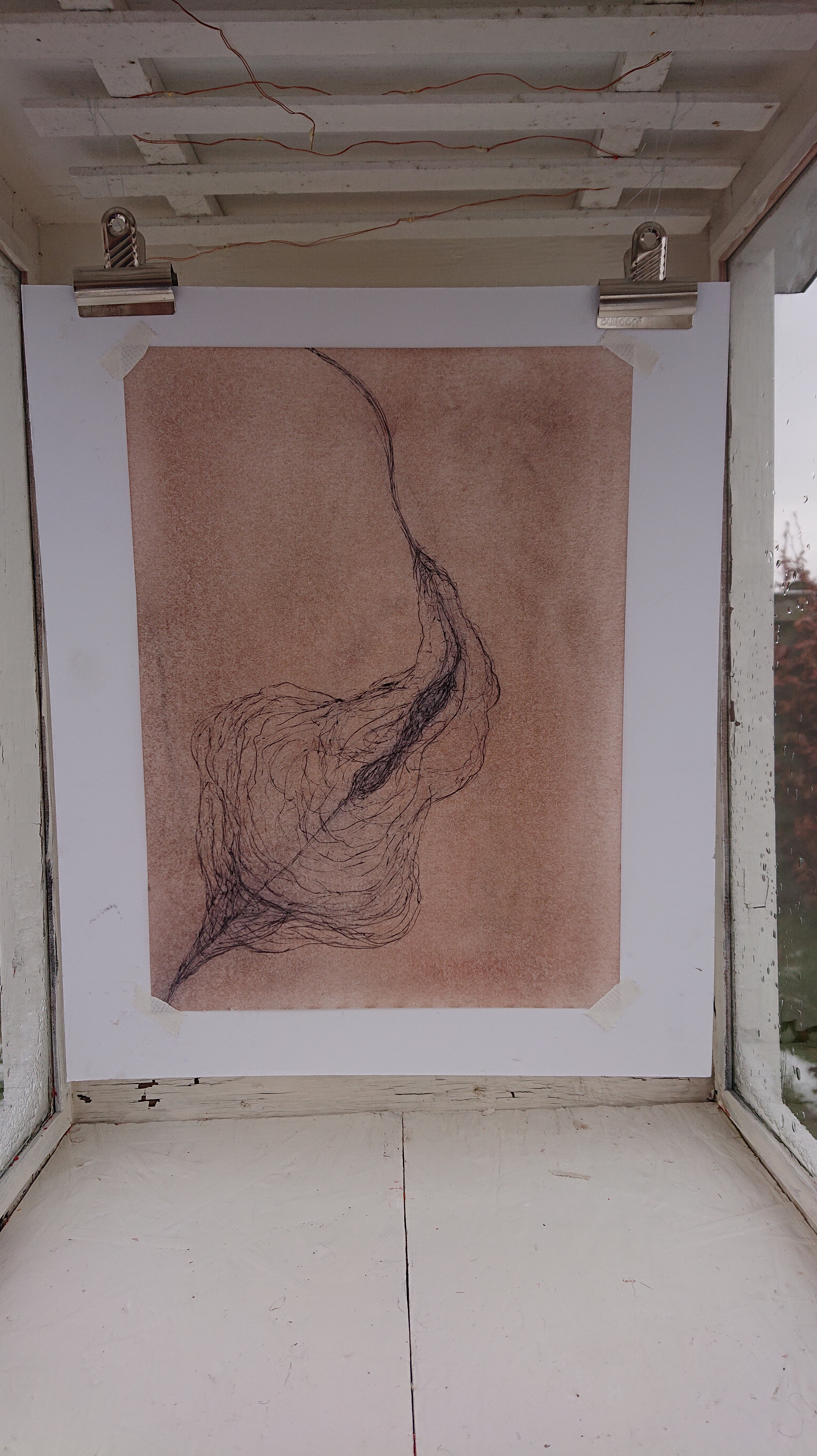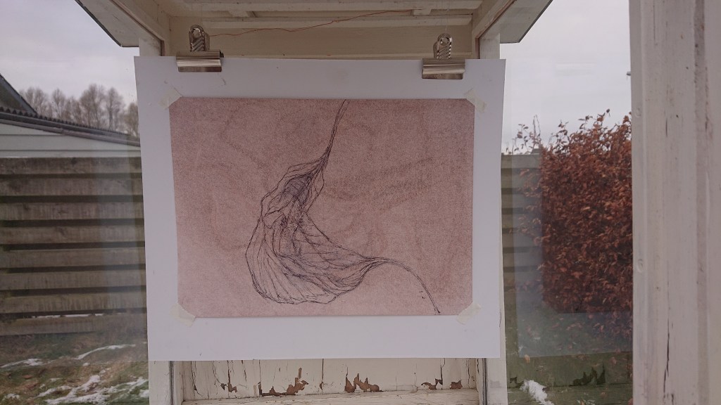 Tegning. Sort kuglepen på oliepastelbehandlet papir.